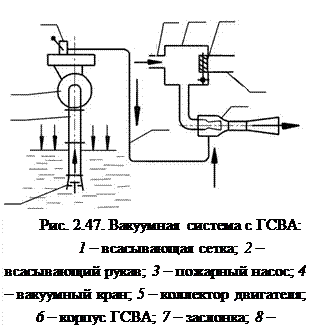 Включение ГВСА производят из насосного отделения при заднем размещении насоса. При этом заслонка 14 займет вертикальное положение и будет открыт путь отработавшим газам в струйный насос 12. Сирену включает водитель в кабине. При этом заслонка 3 займет вертикальное положение, отработавшие газы будут проходить через распределитель 2 в резонатор 1. Изменяя обороты двигателя и, следовательно, количество выходящих отработавших газов, изменяют силу и тон звука, издаваемого сиреной. Работу системы всасывания рассмотрим по схеме, представленной на рис. 2.47. При вертикальном положении заслонки 7 ГСВА и включенном вакуумном кране 4 отработавшие газы двигателя Q p поступят в струйный насос 9. В его камере будет создано разрежение и из полости насоса 3 и всасывающих рукавов 2 начнется удаление воздуха Q э. Под влиянием разности атмосферного давления Р а и разрежения поднимется обратный клапан во всасывающей сетке 1 и вода заполнит всасывающую линию. При выключении вакуумного крана камера струйного насоса будет соединена с атмосферой. Это позволит ГСВА удалить воду из трубки 10, если она туда попала при несвоевременном выключении вакуумного крана. Проверка работоспособности вакуумной системы производится по величине создаваемого разрежения в насосе за нормативное время. Его величина 0,073–0,0076 МПа должна достигаться за 20 с. Герметичность насоса оценивается по падению разрежения в насосе. Оно не должно превышать 0,013 МПа за 2,5 мин. Проверка осуществляется в такой последовательности. Всасывающий патрубок насоса должен быть закрыт заглушкой, вакуумный кран включен. Запустив двигатель, увеличивая его обороты, создают вакуум, оцениваемый по мановакуумметру. Выключив вакуумный кран, по секундомеру фиксируют время падения вакуума. Если в течение 2,5 мин оно будет меньше 0,013 МПа, насос и всасывающая система исправны и работоспособны.