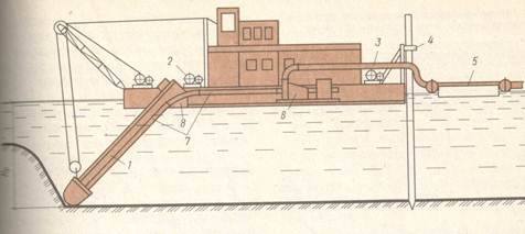 Гидравлическое оборудование Землесосные снаряды являются эффективным и экономическим видом оборудования для производства подводных земляных работ. Их применение целесообразно при разработке несвязных грунтов. Преимущество землесосных снарядов состоит в возможности транспортировать грунт без дополнительных средств на некоторое расстояние от выемок. К недостаткам землесосных снарядов относят: 1. Высокий абразивный износ рабочего колеса и корпуса грунтовогоцентробежного насоса, это ведет к снижению КПД насоса, требует остановки земснаряда для восстановительного ремонта. 2. Необходимость повторных запусков насоса из за срыва вакуума при закупорке грунтом всасывающего наконечника. 3. Падение насыщения пульпы при увеличении глубины разработки, что приводит к значительному снижению производительности земснаряда. 4. Невозможность разработки грунтов, содержащих крупные включения (гальки, камня и др.) Конструктивная схема устройства земснаряда приведена на рис. 72 Рис. 72. Конструктивная схема устройства земснаряда