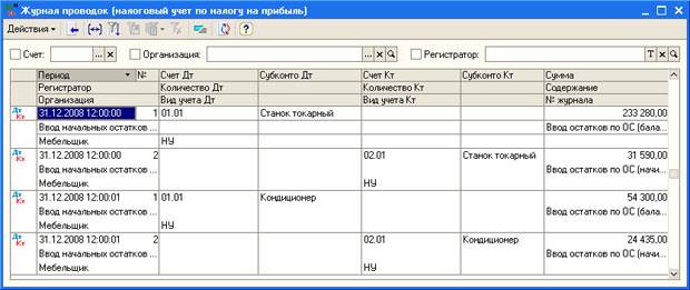 На рис. 4.37 вы можете видеть Журнал проводок (налоговый учет)