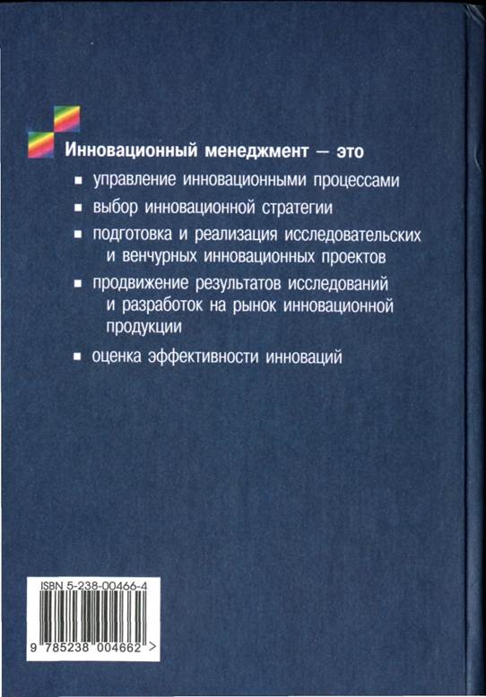 Под редакцией Светланы Дмитриевны Ильенковой ИННОВАЦИОННЫЙ МЕНЕДЖМЕНТ Основные термины 339 Библиографический список 338 Деятельности 315 Новой техники 202 8.1.Управление работами на стадиях жизненного цикла изделия 202 8.2.Функционально-стоимостный анализ 204 8.3.Управление процессом подготовки производства новой техники 211 8.4.Управление техническим уровнем и качеством новой продукции 219 Выводы 231 Вопросы для повторения 232 Глава 9. Прогрессивные производственные технологии 233 9.1.Понятие производственной технологии 233 9.2.Производственные технологии как объект управления 240 9.3.Технологии производства материального продукта 246 9.4.Технологии производства энергетического продукта 251 9.5.Технологии производства интеллектуального продукта 256 9.6.Технологизация и эффективность 268 Выводы 276 9.7.Вопросы для повторения 276 Глава 10. Анализ спроса на научно-техническую продукцию 277 10.1.Портфель проектов 277 10.2.Значение и задачи анализа спроса на инновации 282 10.3.Сущность спроса и способы его представления 284 10.4.Факторы спроса 288 10.5.Виды спроса на новую продукцию 294 10.6.Методы анализа спроса 298 Выводы 306 Вопросы для повторения 306 Глава 11. Оценка эффективности инноваций 307 11.1.Эффективность использования инноваций 307 11.2.Общая экономическая эффективность инноваций 308 Выводы 314 Вопросы для повторения 314 Глава 12. Эффективность инновационной 12.1.Характеристика результатов инновационной деятельности 315 12.2.Выход на рынок технологий как результат инновационной деятельности 319 12.3.Эффективность затрат на инновационную деятельность 325 Выводы 336 Вопросы для повторения 337 Учебник Оригинал-макет Н.Г. Шейко Оформление художника В.А. Лебедева Лицензия серия ИД № 03562 от 19.12.2000 г. Подписано в печать 06.12.2002 (с готовых ps-файлов) Формат 60x88 1/16. Усл. печ. л. 21,5. Уч.-изд. л. 16,5 Тираж 20 000 экз. (1-й завод - 5 000). Заказ 3635 ООО «ИЗДАТЕЛЬСТВО ЮНИТИ-ДАНА» Генеральный директор В.Н. Закаидзе 123298, Москва, ул. Ирины Левченко, 1 Тел. (095) 194-00-15. Тел/факс (095) 194-00-14 www.unity-dana.ru E-mail: unity@unity-dana.ru Отпечатано во ФГУП ИПК «Ульяновский Дом печати» 432980, г. Ульяновск, ул. Гончарова, 14