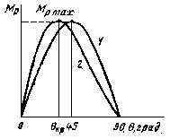 Рис. 6.2. Максимальне значення моменту Мр. Під впливом активного опору обмотки статора максимальне значення реактивного моменту наступає при qкр<450 (qкр=30¸400). Це збільшує крутизну кривої Мр=f(q) в її початковій частині (рис.18.2, крива 2), а тому, підвищує величину питомого синхронізуючого моменту М пит. Питомий синхронізуючий момент - це момент, що приходиться на 10 кута q Мпит = DМр/Dq і визначає стійкість роботи реактивного двигуна. Максимальний момент реактивного двигуна прийнято називати моментом виходу з синхронізму. Справа в тому, що якщо навантаження на валу двигуна досягне значення, при якому кут q>qкр, відбудеться “випадання” двигуна із синхронізму. В цьому випадку ротор двигуна або зупиняється, або продовжує обертатися асинхронно під дією електромагнітного моменту, що створюється струмами пускової короткозамкненої обмотки. Величина реактивного моменту пропорційна квадрату підведеної до двигуна напруги ( Представимо індуктивні опори обмотки статора по повздовжній xd і поперечній xq вісям у вигляді xd = 2pf1Ld; xq = 2pf1Lq, (40) де Ld i Lq - індуктивності обмотки статора по повздовжній і поперечній вісям:
