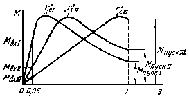 де RMq=1/Lq i RMd=1/Ld - магнітні опори по поперечній і повздовжній вісям машини. З формули випливає, що реактивний момент пропорційний різниці магнітних опорів по поперечній Rmq i повздовжній Rmd вісям машини. З заглибленням впадин на роторі (див. рис.18.1, а) збільшується різниця магнітних опорів по поперечній і повздовжній вісям і реактивний момент збільшується, а тому, збільшується і мемент виходу із синхронізму. Але заглиблення впадин на роторі доцільне лише до визначеної межі, так як з збільшенням глубини впадин збільшується середня величина повітряного проміжку. Це веде до зменшення обертового моменту в пусковому асинхронному режимі. Останнє приводить до зниження пускового моменту і моменту входу двигуна в синхронізм - найбільшого моменту опору, при якому ротор двигуна ще втягується в синхронізм. Для втягування в синхронізм необхідна частота обертання ротора не менше 0,95n1, тобто ковзання s£0,05. На рис.6.3 зображений ряд залежностей електромагнітного моменту від ковзання при різних значеннях активного опору пускової клітки, причому