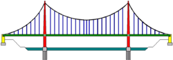 Схема конструкции висячего моста Как правило, мосты состоят из пролётных строений и опор. Пролётные строения служат для восприятия нагрузок и передачи их опорам; на них может располагаться проезжая часть, пешеходный переход, трубопровод. Опоры переносят нагрузки с пролётных строений на основание моста. Пролётные строения состоят из несущих конструкций: балок, ферм, диафрагм (поперечных балок) и собственно плиты проезжей части. Статическая схема пролётных строений может быть арочной, балочной, рамной, вантовой или комбинированной; она определяет тип моста по конструкции. Обычно пролётные строения прямолинейны, однако в случае необходимости (например, при постройке эстакад и дорожных развязок) им придают сложную форму: спиралеобразную, кольцевую, и т. д. Пролётные строения поддерживаются опорами, каждая из которых состоит из фундамента и опорной части. Формы опор могут быть весьма разнообразными. Промежуточные опоры называются быками, береговые — устоями. Устои служат для соединения моста с подходными насыпями. Материалами для мостов служат металл (сталь и алюминиевые сплавы), железобетон, бетон, природный камень, дерево, верёвки.