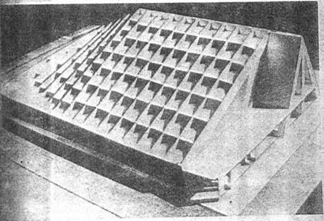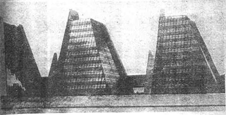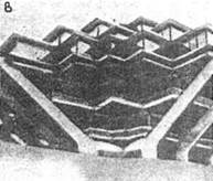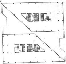 Важно отметить, что в то время такое решение соответствовало новым эстетическим представлениям, новым инженерным и экономическим потребностям застраиваемых городов, и, кроме того, отличалось простотой воспроизводимости. Осуществление на практике такой конфигурации непроизвольно оказало большое влияние на развитие сейсмостойкого проектирования. Простая кубическая форма здания привела к необходимости исключения из практики строительного производства традиционных ступенчатых форм многоэтажных зданий, что в свою очередь способствовало пересмотру норм сейсмостойкого строительства в отношении проектирования уступов. В результате в нормах была принята открытая зона в уровне нижнего этажа при отсутствии архитектурных уступов и высоте здания, ограничиваемая только потребностями заказчика. Открытая зона, часто создаваемая за счет установки коробки здания на колонны, имеющая нередко застекленный вестибюль на уровне нижнего этажа, сама по себе являлась выражением одной из догм современного направления в архитектуре, предложенной Ле Корбюзье. Впоследствии такое конструктивное решение было принято при проектировании сейсмостойких зданий и сооружений, и выражалось в создании гибких первых этажей, когда основная конструкция не доходила до уровня фундамента, или каким-либо другим способом обеспечивалась разрезность жесткости несущих элементов в уровне второго этажа. В то же время исключение из конструкции зданий архитектурных уступов также имело положительный результат с точки зрения сейсмостойкого проектирования. В конце 1940-х гг. изменился ряд нормативных положений, касающихся сейсмостойкого строительства (было разрешено использование сплошного остекления вместо заполнения между колоннами в виде кирпичной кладки или железобетонных перегородок). Стали применяться навесные стеновые панели, которые, в сочетании с гибкими каркасными конструкциями, вызвали серьезные проблемы в зонах сейсмической активности в связи с возможностью разрушения ненесущих элементов в зданиях средней и повышенной этажности. Начало третьего этапа проектирования административных зданий можно отнести к середине 1960-х гг., и его элементы присутствуют в современной архитектуре. Стремление к созданию чистой геометрической формы получило дальнейшее развитие. Наиболее примечательным является использование наклонных плоскостей под углом до 45° (рис. 4.3.7), применение призматической формы с отражающим стеклом, которое улучшает тепловой режим здания. Эти формы достигают более высокой степени геометрической абстракции в 1950-х и 1960-х гг. В наши дни для проектирования административных зданий характерна модификация форм с учетом возросших требований экономии энергии на основе признания того факта, что ранее построенные здания этому требованию не отвечают. В особенности это относится к режимам освещенности помещений: стоимость освещения большинства внутренних помещений сравнительно высока, но, кроме этого, требуются дополнительные затраты для систем кондиционирования воздуха. Одновременно с этими недостатками технологического и экономического характера, вызывает недовольство сам тип административного здания и оформление его интерьеров в виде просторных помещений с мягким, но не всегда удобным освещением.