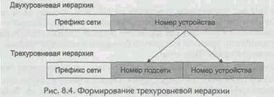 Автономные системы Сегодня Internet значительно отличается от той сети, которая была создана в 1980 году. Internet стала мировой, общедоступной информационной сетью, которая удваивается в размерах каждые девять месяцев. Однако столь бурный рост Internet неизбежно привел к выявлению большого количества проблем, связанных с маршрутизацией. При этом: q Производительность протоколов маршрутизации значительно снизилась; q Размер сообщений, которыми обмениваются маршрутизаторы для поддержания своих таблиц маршрутизации растет, что требует все больших ресурсов маршрутизаторов и все большей пропускной способности сети; q Большое число маршрутизаторов, работающих с протоколами маршрутизации, делают поддержку механизмов обнаружения и изоляции сбоев практически невозможной. Для того чтобы в какой-то степени снизить влияние этих факторов, сеть Internet разделили на отдельные автономные системы (Autonomous System). Автономная система (АС) представляет собою группу сетей и маршрутизаторов, управляемую уполномоченным. АС позволяет независимо управлять различными частями Internet и разрешает маршрутизаторам внутри различных АС использовать разные протоколы маршрутизации. Каждая сеть внутри АС должна быть доступна из Internet. Маршрутизаторы внутри одной АС взаимодействуют, используя динамические протоколы маршрутизации. Протоколы, управляющие маршрутной информацией внутри АС, относятся к классу так называемых протоколов IGP (Interior Gateway Protocol, внутренний шлюзовой протокол). Главной задачей протоколов класса IGP является поддержание необходимой производительности. Эти протоколы должны немедленно подстраиваться под изменения в сетевойтопологии и находить маршрут с наименьшей стоимостью. Отдельные протоколы класса IGP это: RIP, NLSP, OSPF, IGRP, EIGRP и IS-IS. Взаимодействие между маршрутизаторами, принадлежащими к различным АС, требует дополнительного протокола, который называется EGP (Exterior Gateway Protocol, внешний шлюзовой протокол). Так как различные АС управляются совершенно независимо, в протоколе предприняты меры, предотвращающие влияние сбоев в других АС. Необходимо учитывать, что для связи с маршрутизаторами внутри АС корневой маршрутизатор (см. ниже), кроме поддержки EGP, должен также поддерживать протоколы класса IGP, так как всю информацию о своей АС протокол EGP получает через IGP. Как известно, IP-адрес состоит из двух иерархических уровней. Необходимость во введении третьего уровня иерархии — уровня подсетей — была продиктована возникновением дефицита номеров сетей и резким ростом таблиц маршрутизации маршрутизаторов в Internet. После введения уровня подсети номер устройства разделяется на две части — номер подсети и номер устройства в этой подсети (рис. 8.4).