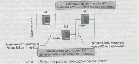 Маршрутизатор М2 может достигнуть целевой сети через маршрутизатор Ml за 1 переход. Маршрутизатор М3 получает эту информацию из периодических сообщений об обновлении от маршрутизатора М2. Поэтому МЗ может достигнуть целевую сеть через маршрутизатор М2 за 2 перехода. В следующем цикле посылки сообщений об обновлении маршрутизатор МЗ известит маршрутизатор М2 о достижимости целевой сети за 3 перехода. В результате маршрутизатор М2 будет иметь два маршрута в целевую сеть: первый маршрут с использованием маршрутизатора Ml и количеством переходов 1, а второй маршрут с использованием маршрутизатора МЗ и количеством переходов 3. Маршрутизатор М2 выберет маршрут через маршрутизатор Ml, так как он имеет наименьшую метрику. В случае, если канал связи между маршрутизаторами Ml и М2 выйдет из строя, М2 не получит сообщение об обновлении в требуемый интервал времени и удалит из своей таблицы запись о маршруте в целевую сеть через Ml. В результате у маршрутизатора М2 будет сформирована запись о маршруте в целевую сеть через маршрутизатор МЗ за 3 перехода. Следовательно, М2 будет пересылать весь трафик маршрутизатору МЗ, тот его пошлет обратно М2 и т. д. Таким образом образуется логическая петля маршрутизации. Обмен пакетами между маршрутизаторами будет продолжаться до тех пор, пока поле TTL в заголовке IP-дейтаграммы не станет равно 0. Тогда дейтаграмма будет удалена одним из маршрутизаторов. Существует несколько технологий, которые ускоряют сходимость протокола RIP IP и повышают его производительность. К ним относятся: расщепление горизонта (Split-Horizon), обратное исправление (Poison Reverse), мгновенное изменение (Triggered Update) и временный отказ от приема информации Hold-Down (приостановка) и Garbage-Collection (сборка мусора). Описанная проблема «обоюдного обмана» может быть решена путем определения направления посылки маршрутной информации. Согласно технологии Split-Horizon маршрутизатор не будет распространять информацию об определенном маршруте через порт, который явился источником данной информации. Другими словами, маршрутизатор не будет информировать о достижимости получателя своего соседа, от которого была получена информация о маршруте к получателю. На рис. 8.11 показано, каким образом Split-Horizon устранит образовавшуюся петлю.