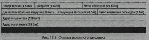 В каждом из адресов префикс необходимо дополнить нулями, число которых определяется требуемым остатком бит для задания адреса линии или узла. Адреса для узла присваиваются узлам, имеющим маршрутизаторы, но не подключенным к сети Internet через провайдера. При подключении этого узла к сети Internet маршрутизатор настраивается с новым префиксом. По сути дела, маршрутизатор создает адрес по принадлежности к провайдеру открытием полей «Идентификатор организации», «Идентификатор провайдера» и «Идентификатор абонента». q Multicast – адрес набора узлов (групповой адрес). В протоколе IPv6 отсутствует понятие широковещательного адреса. Широковещательная адресация заменена поддержкой групповой передачи данных. Такой механизм необходим протоколу IPv6 для регулирования пропускной способности сети при распространении мультимедийного трафика; q Anycast – адрес набора узлов. Этот тип адресов используется для обеспечения прохождения своего трафика через маршрутизаторы отдельных провайдеров. В отличие от групповых адресов, такая дейтаграмма должна быть доставлена любому члену группы. В протоколе IPv6 широко используется маршрутизация от источника. Этот вид маршрутизации освобождает маршрутизаторы от функции анализа своих таблиц маршрутизации, уменьшает время задержки дейтаграммы для ее обработки и, естественно, повышает пропускную способность сети в целом; q При назначении адресов каждому порту маршрутизатора вместе с физическим адресом присваивается еще один адрес, общий для всех портов всех маршрутизаторов в сети данного провайдера, который является апу-cast-адресом; q При указании нечеткого адреса устройству не надо знать конкретный адрес маршрутизатора, так как оно является членом группы маршрутизаторов с этим адресом. Положительным моментом здесь является то, что в случае изменения местоположения этого маршрутизатора адрес его менять не надо, так как дейтаграмма будет отправляться по-прежнему ближайшему члену этой нечеткой группы. Для плавного перехода к протоколу IPv6 введен специальный тип адресов – IPv4-compatible (совместимые адреса). В этих адресах старшие 96 бит содержат нули, а младшие 32 бита – обычный адрес IPv4. Такие адреса позволяют решить проблему совместимости частей Internet, работающих с протоколами IP разных версий. Для упрощения обработки заголовка дейтаграммы в протоколе IPv6 введены основной и дополнительный заголовки. Основной заголовок присутствует всегда. Дополнительный заголовок определяет некоторые необязательные параметры. Основной заголовок имеет длину 40 байт (рис. 13.6).