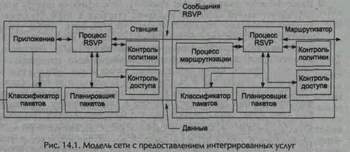 Как показано на рис. 14.1, приложение, которое хочет послать свои пакеты с данными в зарезервированном потоке, обращается к услугам протокола RSVP. Протокол RSVP начнет осуществлять резервирование потока с требуемым QpS, который будет принят, если само приложение удовлетворяет выдвинутым ограничениям, а маршрутизаторы могут обеспечить требуемое QoS. Протокол RSVP уведомляет классификатор пакетов и планировщик пакетов каждого маршрутизатора о необходимости проведения соответствующей обработки пакетов этого потока. Если приложение теперь передаст пакеты данных классификатору пакетов первого маршрутизатора, который присвоил этому потоку определенный сервисный класс, обеспечивающий требуемый QoS, то поток, прежде чем он будет отправлен по своему IP-адресу, будет передан планировщику пакетов. Планировщик пакетов определяет очередность отправки пакетов этого приложения в зависимости от сервисного класса и отправляет их или на следующий маршрутизатор, или на конечную станцию, которая является пунктом назначения. Поскольку протокол RSVP работает как бы в симплексном режиме, то резервирование QoS производится только в одном направлении, а именно, от отправителя до получателя. Если приложение хочет отменить резервирование для своего потока данных, оно посылает сообщение в инстанцию, отвечающую за резервирование, которая освобождает зарезервированные ресурсы на всех маршрутизаторах по пути следования потока. Эти ресурсы теперь могут использоваться для других потоков. Технические требования на IS определены в документе RFC 1633.