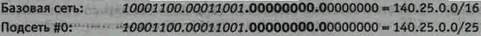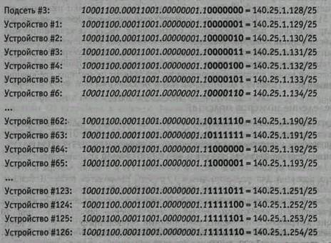 Итак, администратор выделил 7 битов для идентификации устройств в каждой подсети. Это означает, что каждая подсеть имеет 126 адресов для идентификации устройств. Устройства в подсети нумеруются от 1 до 126. Приведем перечень адресов устройств для подсети #3. При этом курсивом выделен расширенный сетевой префикс, в то время как полужирным шрифтом показано 7-разрядное поле номера устройства.