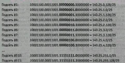 Определение номеров подсетей Выделенные 512 подсетей пронумеруем от 0 до 511. Если выделить 9 разрядов для двоичного представления десятичных чисел от 0 до 511, то получим: 0 (000000000)2, 1 (000000001)2, 2 (000000010)2, 3 (000000011)2,..., 511 (111111111)2. Например, для определения подсети номер 3 (#3) сетевой администратор размещает двоичное представление числа 3 (000000011)2 в 9 битах номера подсети. Номера подсетей для рассматриваемого примера приводятся ниже. В каждом адресе курсивом выделен расширенный сетевой префикс всего адреса, в то время как 9-битовое представление поля номера подсети выделено полужирным шрифтом.
