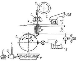 Рис. 5.22. Схема плазмового напилення з подальшим наплавленням [67]: 1 - джерело живлення; 2 - баластний реостат; 3 - живильник для подачі порошку; 4 - плазмовий пальник; 5 і 6 - введення і виведення води, що охолоджує, 7 – трубопровід; 8 - ремонтована деталь; А - головка для напилення; Б – головка для наплавки. Підвищення міцності зчеплення покриття з ремонтованою поверхнею забезпечує напилення з подальшим наплавленням (рис. 5.22), при якому відпадає необхідність в спеціальних заходах по підвищенню шорсткості поверхні. Металізацію застосовують: для ремонту сильно зношених сталевих валів і місць під нерухомі посадки; закладення тріщин в ненавантажених елементах чавунних деталей; усунення пористості в чорному і кольоровому литві; для захисту від цементації місць, що не підлягають дифузійному насиченню вуглецем і отримання псевдосплавів, які перевершують по властивостях. Ремонт електролітичним нарощуванням заснований на використанні процесу електролітичної дисоціації, суть якого полягає в тому, що при пропусканні електричного струму через розчин електроліту (водний розчин солей і кислот) він дисоціює, тобто розпадається на протилежно заряджені іони, при цьому іони з позитивним зарядом (катіони) у вигляді атомів металу і водню прямують до катода, а негативно заряджені (аніони) - до анода. Досягнувши катода, іони металу віддають свій заряд і осідають на ньому у вигляді нейтральних атомів. Якщо в якості катода використовувати ремонтовану деталь, то атоми металу осідають на ній, створюючи шар покриття. Для отримання покриття певним видом металу (хром, залізо, мідь, цинк) необхідно, щоб електроліт містив його сіль або з нього був виготовлений анод. Відповідно до закону Фарадея, час електролізу, необхідний для отримання покриттів товщиною d, визначають по формулі [28]