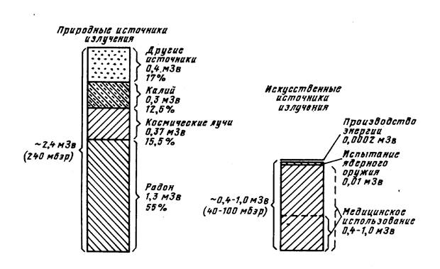 Рис. 4.1. Средние значения эффективных эквивалентных доз облучения, получаемых ежегодно отдельными лицами от природных источников излучения в районах с нормальным фоном и от искусственных источников излучения (по данным Международного агентства по атомной энергии - МАГАТЭ) [4]
