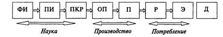 Рис. 3.1. Инновационная цепь Этапы определяют последовательность прохождения пути от научного знания к реальному продукту. Начальной стадией инновационного цикла является наука. Она обеспечивает познание объективных законов природы и превращение этого знания в научный информационный продукт, который может быть использован в производстве. Стадия «наука» включает: - фундаментальные исследования (ФИ); - прикладные исследования (ПИ); - проектно-конструкторские работы (ПКР). Фундаментальные и прикладные исследования, а также проектно-конструкторские работы тесно связаны между собой и взаимно стимулируют друг друга. На стадии производства осуществляется выпуск продукции (услуг) на основе использования результатов предыдущих этапов инновационного цикла. Эта стадия включает: - освоение производства продукции (ОП), которое предполагает полную информационную, техническую и организационную подготовку к промышленному производству продукции; - собственно производство продукции (П). Использование новой продукции происходит в сфере потребления. Здесь выделяются следующие этапы: - реализация новой продукции (Р); - эксплуатация новой продукции потребителем (Э), с возможным включением послепродажного обслуживания различных технических устройств, приобретенных потребителями; - диффузия новшества (Д). Характеристика этапов стадий «наука» и «производство» приведена в табл. 3.3. Последовательное выполнение этапов инновационного цикла, а также работ внутри каждого этапа существенно удлиняет весь процесс. И часто бывает невозможным внесение изменений в конструкцию изделия, его качество или исправление недостатков, обнаруженных на последних этапах инновационного цикла. Точно так же не всегда можно сразу устранить дефекты, замеченные потребителями.