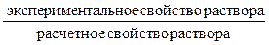 Наличие взаимодействия между ионами в растворах сильных электролитов приводит к тому, что найденная экспериментально степень диссоциации сильного электролита оказывается несколько меньше 1. Ее называют кажущейся степенью диссоциации и рассчитывают по формуле a = где i – изотонический коэффициент Вант-Гоффа. Изотонический коэффициент i показывает, во сколько раз экспериментально найденное свойство раствора электролита отличается от такого же свойства, вычисленного для раствора неэлектролита при той же концентрации: i = где «свойство раствора» – Р осм, D Р, D Т кип или D Т зам. Коллигативные свойства для разбавленных растворов электролитов следует оценивать с учетом изотонического коэффициента по формулам