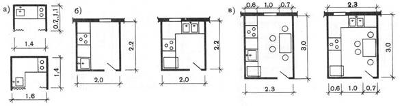 Рис.6.15. Основные типы кухонь: а) кухня-ниша; б) рабочая кухня; в) кухня-столовая Площадь кухни зависит от размеров квартиры, но должна быть не менее 8 м2 и иметь ширину не менее 2 м. Кухни-столовые должны иметь площадь не менее 12 м2. Все виды кухонь оборудуют стационарным кухонным оборудованием и специальной мебелью. Основным предметом оборудования является плита газовая, электрическая или на твердом топливе (в зависимости от местных условий). Рядом с плитой размещается рабочий стол со встроенной мойкой, который является одновременно шкафом для хранения кухонного инвентаря. Над столом располагаются навесные шкафы для хранения обеденной и чайной посуды, продуктов. Форма, цвет, материал, из которого выполнено кухонное оборудование, в основном решают композицию интерьера, а его рациональное расположение создает удобства и экономит труд и время хозяйки, поэтому оборудованию современной кухни архитекторы должны уделять особое внимание. Расположение оборудования кухни зависит от пропорций ее помещения, расположения проемов и т.д. Оно может быть однорядным, двухрядным или угловым. Санитарный узел квартиры включает помещения, где располагаются ванная или душевой поддон, умывальник и унитаз. В однокомнатных и небольших двухкомнатных квартирах, предназначенных для одиноких и малосемейных, целесообразны совмещенные санитарные узлы, где все санитарно-технические приборы размещаются в одном помещении. В квартирах, предназначенных для больших семей, приборы необходимо размещать в отдельных помещениях: ванную с умывальником – в ванной комнате, а унитаз – в уборной. С целью повышения комфорта в таких квартирах возможно расположение совмещенного санитарного узла в зоне спален и уборной с умывальником в зоне кухни и общей комнаты. Для оборудования санитарных узлов выпускают санитарно-технические приборы стандартных размеров. Размеры помещений санитарного узла определяются расстановкой и размерами оборудования (рис.6.16). Кроме того, в ванной комнате следует предусмотреть место для стиральной машины размером не менее 0,75 × 0,50 м. Размеры ванных и душевых зависят также от типа горячего водоснабжения в доме, которое может быть центральным, не требующим установки водонагревательных приборов, и местным, с водогрейной колонкой на твердом топливе или газовой колонкой. Дровяная или угольная колонка требует специального места на полу, газовая колонка подвешивается на стене над ванной. Объем ванной комнаты, оборудованной газовым водонагревателем, должен быть не менее 7,5 м3. При этом двери должны иметь внизу вентиляционные решетки или зазор между дверью и полом для притока воздуха.
