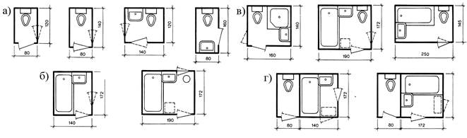 Рис.6.16. Санитарные узлы и их оборудование: а) уборные; б) ванные; в) совмещенные санитарные узлы; г) раздельные санитарные узлы