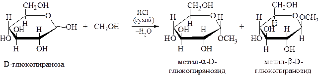 Эта реакция используется как качественная для доказательства наличия в структуре моносахаридов двух и более гидроксильных групп, способных образовывать с катионами металлов внутрикомп-лексные соединения в виде пяти- или шестичленных циклов. Если через раствор D-глюкозы в метаноле пропустить газообразный HCl, то в результате нуклеофильного замещения гликозидной OH-группы на алкоксильную группу образуется циклический ацеталь, который называется гликозид: