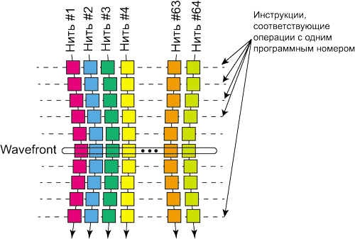 Одним из фундаментальных для архитектуры графических процессоров AMD является понятие wavefront. Дело в том, что все графические процессоры (и NVIDIA, и AMD) архитектурно устроены таким образом, чтобы обрабатывать одновременно множество потоков инструкций (нитей), количество которых может исчисляться тысячами. Собственно, в этом заключается главная особенность графических процессоров — возможность параллельной обработки огромного множества программных нитей. Однако эффективная обработка таких нитей возможна только в том случае, если все нити графической программы, осуществляя параллельную обработку данных, в целом движутся параллельным курсом по коду программы, причем для всех нитей в конкретный момент времени реализуется одна и та же операция, но с разными данными. Так вот, графические процессоры AMD предыдущего поколения устроены таким образом, что каждый мини-процессор (SIMD Engine) может выполнять только одну операцию (инструкцию с одним программным адресом), но с разными операндами. То есть все 16 SPU в блоке SIMD Engine процессора, к примеру, Cayman выполняют одну и ту же инструкцию. Например, это может быть инструкция сложения содержимого двух регистров: она одновременно выполняется всеми SPU блока SIMD Engine, но регистры берутся разные. Собственно, отсюда и название SIMD (Single Instruction, Multiple Data — одна инструкция, множество данных). Напомним, что каждый SPU содержит четыре или пять (в зависимости от модели графического процессора) исполнительных блоков (ALU), что позволяет каждому SPU одновременно обрабатывать четыре или пять нитей. При параллельной обработке программных нитей графических программ такой подход себя оправдывает и позволяет достаточно равномерно загружать все исполнительные блоки. Если же в результате ветвления в программе нити расходятся в своем пути исполнения кода, то происходит так называемая сериализация. В этом случае используются не все исполнительные блоки в SIMD Engine, поскольку нити подают на исполнение различные инструкции, а SIMD Engine может исполнять только инструкцию с одним адресом. Естественно, в этом случае производительность снижается. Если рассматривать параллельно расположенные нити, то перпендикулярный срез 64 нитей, соответствующих инструкции с одним программным адресом, называется wavefront (волновой фронт нитей) — рис. 2. Понятно, что в графических программах операции с одним программным адресом могут соответствовать не 64 нити, а существенно больше, то есть инструкция с одним программным адресом может порождать несколько wavefront.
