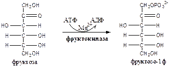Фруктоза и галактоза наряду с глюкозой используются для получения энергии или синтеза веществ: гликогена, ТГ, ГАГ, лактозы и др. Значительное количество фруктозы, образующееся при расщеплении сахарозы, превращается в глюкозу уже в клетках кишечника. Часть фруктозы поступает в печень. Метаболизм фруктозы в клетке начинается с реакции фосфорилирования: 1.Фруктокиназа (АТФ: фруктоза-1-фосфотрансфераза) фосфорилирует только фруктозу, имеет к ней высокое сродство. Содержится в печени, почках, кишечнике. Инсулин не влияет на ее активность.