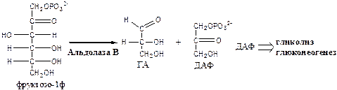 2. Альдолаза В (фруктозо: ГА-лиаза) есть в печени, расщепляет фруктозо-1ф (фруктозо-1,6ф) до глицеринового альдегида (ГА) и диоксиацетонфосфата (ДАФ).