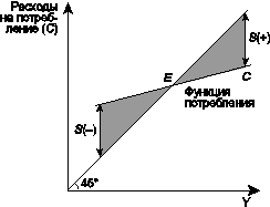 Рис. 2.7. Функция потребления Рост дохода за пределы указанной величины позволит не только увеличить потребление, но и сберегать часть дохода (S). Уменьшение дохода ведет к тому, что приходится расходовать сбережения предыдущих периодов (отрицательные сбережения). Графическая интерпретация функции сбережения, т. е. сбережения от располагаемого дохода, представляет собой как бы зеркальное отражение функции потребления (рис. 2.7). Построенная в координатах «сбережения ¾ доход», она наглядно демонстрирует описанные выше ситуации в потребительском поведении, возникающие при изменении дохода ¾ нулевое (точка Е), отрицательное (слева от точки Е) и положительное (справа от точки Е) сбережения (рис. 2.8).