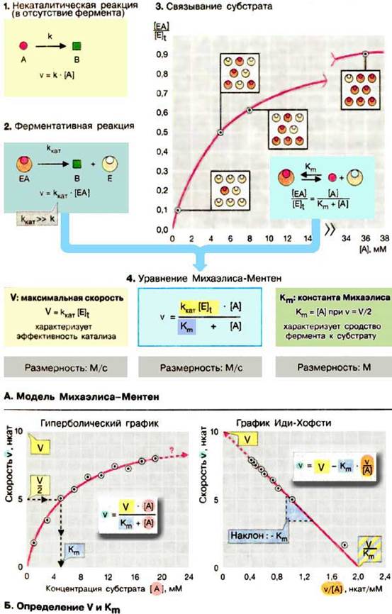 Кинетика ферментативной реакции (т. е. зависимость скорости реакции от ее условий) определяется в первую очередь свойствами катализатора, вследствие чего она значительно сложнее, чем кинетика некаталитических реакций (см. с. 28).