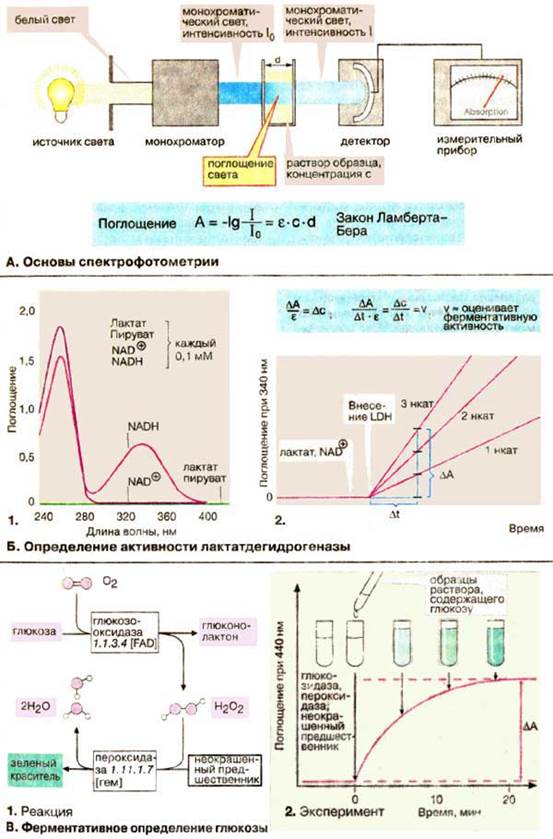 Многие молекулы поглощают свет в видимой или ультрафиолетовой области спектра. Это свойство можно использовать для определения концентраций. Величина поглощения зависит от типа и концентрации вещества, а также от длины волны используемого света. Поэтому применяют монохроматический свет, т. е. свет определенной длины волны, который можно выделить из белого света с помощью монохроматора. Монохроматический свет интенсивности I0 проходит через прямоугольную ячейку из стекла или кварца (кювету), в которой находится раствор поглощающего вещества. Интенсивность I выходящего света, ослабленного поглощением, измеряется с помощью детектора. Поглощение света (А) раствора (оптическая плотность) определяется как отрицательный логарифм отношения I / I0. Закон Ламберта-Бера гласит, что А пропорциональна концентрации (с) вещества и толщине (d) слоя раствора. Коэффициент экстинкции ε зависит, как было указано выше, от типа вещества и длины волны.