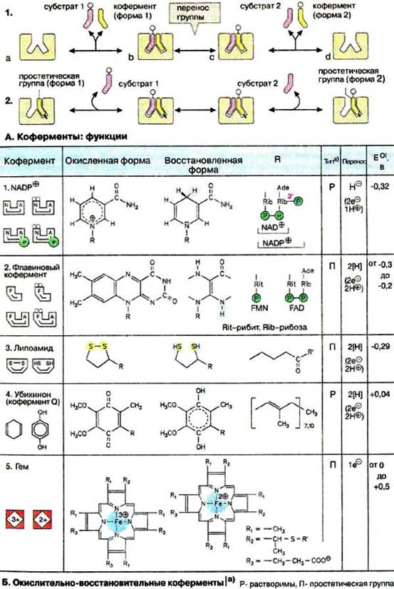Многие ферментативные реакции включают перенос электронов или групп атомов с одного субстрата на другой. В таких реакциях всегда принимают участие вспомогательные соединения (коферменты), которые выполняют функцию промежуточных переносчиков атомов или функциональных групп. Так как эти вещества каталитически не активны, правильнее было бы их называть косубстратами. Ферменты обычно высокоспецифичны к своим субстратам (см. с. 94), коферменты же взаимодействуют со многими ферментами, обладающими различной субстратной специфичностью.
