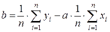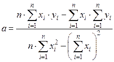 Значения коэффициентов при неизвестных a и b определяем из первоначальной таблицы как соответствующие суммы значений переменных х, у. Решая эту систему относительно коэффициентов a и b:, получим: