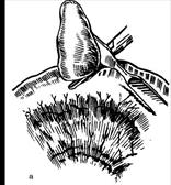 Показания: воспаление, перфорация, кровотечение из дивертикула. Техника. Если основание дивертикула широкое, то на него в поперечном направлении накладывается зажим, дивертикул над зажимом срезается ножницами или электроножом (рис. 54).
