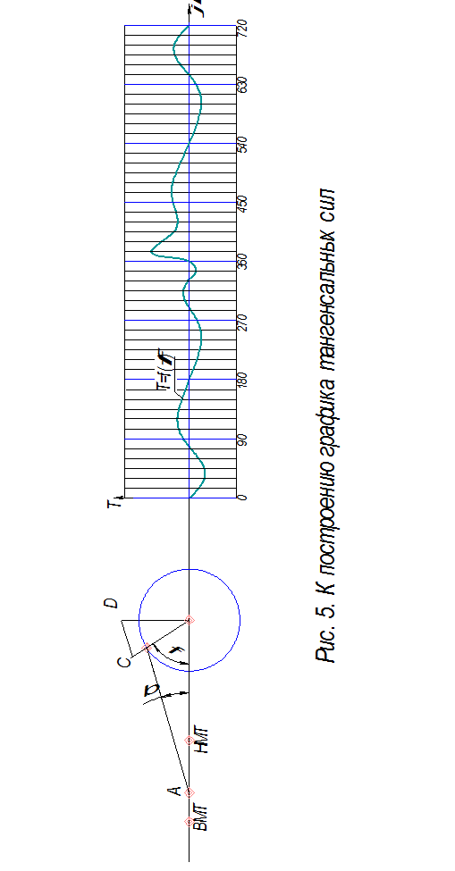 Для определения тангенциальной силы строится схема кривошипного механизма в произвольном масштабе, но с учетом выбранного отношения , рис.5. От центра кривошипа по направлению радиуса кривошипа откладывают отрезок , равный суммарной силе для данного угла поворота коленчатого вала в принятом масштабе сил.