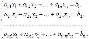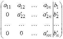 Умножение какого-либо уравнения системы на число и прибавление к другому уравнению не меняет системы. Используя этот факт, преобразуем расширенную матрицу системы к следующему виду: в первом столбце все элементы, начиная со второго равны нулю; во втором столбце все элементы, начиная с третьего равны нулю; в третьем— начиная с четвёртого и т.д. В результате матрица приводится к ступенчатому виду. Возможны три основные случая: 1) Матрица имеет треугольный вид (число неизвестных равно числу линейно независимых уравнений), система имеет единственное решение. Записываем систему, соответствующую преобразованной матрице, из последнего уравнения находим 2) Система содержит хотя бы одно уравнение вида 3) Матрица не треугольная, так как последнее уравнение содержит более одного неизвестного, система имеет бесконечно много решений. Задача 13. Решить систему методом Гаусса
