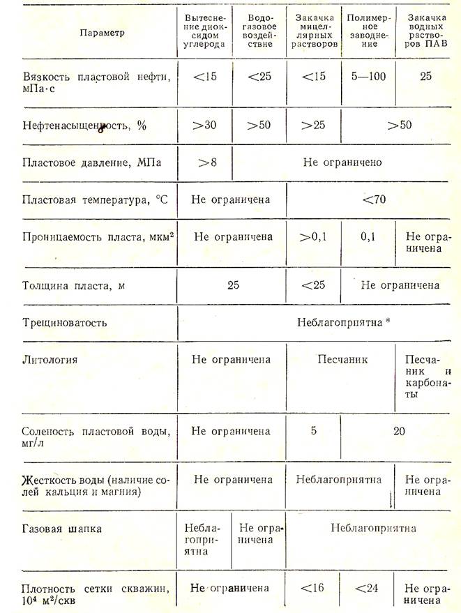 Таблица 2. Основные критерии для применения физико-химических и газовых методов повышения нефтеотдачи.