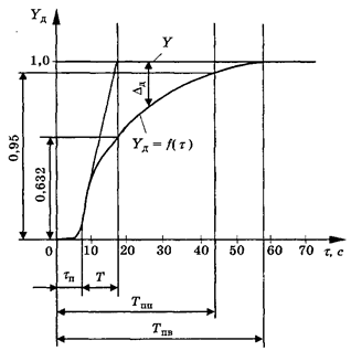 Рис.4. 2 - Динамічна характеристика вимірюваної величини Час початку реагування τп — час від початку зміни вимірюваної величини на вході приладу до початку зміни показів приладу (значення вихідного сигналу). Час перехідного процесу T пп— час, протягом якого показання приладу після початку зміни вхідної вимірюваної величини досягнуть значення з 5-процентним відхиленням (Хд=0,95). Повний час встановлення значення вимірюваної величини Т пп— час, протягом якого значення вимірюваної величини досягає свого сталого значення від початку зміни вхідної величини на вході приладу. Постійна часу Т — час, протягом якого вихідна вимірювана величина досягає 0,632 свого сталого значення на виході приладу, тобто це час перехідного процесу, який описується рівнянням експоненти.