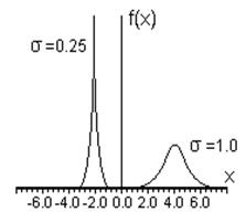 Функция Гаусса описывает предельное распределение результатов измерений величины x, истинное значение которой равно X. Причем при измерении величины x оказываются только случайные ошибки. Принято считать, что результаты измерений распределены нормально, если их предельное распределение описывается функцией Гаусса. В формуле (4.1) величина σ является фиксированным параметром, который определяет ширину гауссовой кривой в точках перегиба. Малые значения σ приводят к распределению типа острого пика, которое соответствует более точным измерениям, в то время как большие значения σ дают широкое распределение, соответствующее измерениям с малой точностью. На Рис.6 представлены два примера графиков функций Гаусса с различными значениями величин Х и σ. Видно, что величина σ в знаменателе предэкспоненциального множителя формулы (4.1) обеспечивает для более узкого распределения (малые σ) большую высоту в точке x = X. Это обусловлено тем, что функция Гаусса нормирована, то есть для нее выполнено условие (3.1.6). Поэтому площадь под кривой, выражающей на графике функцию Гаусса, при любых значениях σ и X должна равняться единице.
