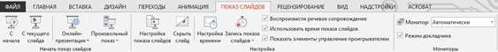 1.2.2 Перегляд слайдів і проведення презентацій Створена презентація може бути настроєна відповідно до потреб доповідача. Тобто, можна встановити режим виконання презентації, а також керувати зміною слайдів і їх складом. Для настройки: відкрити презентацію, виконати команду Показ слайдов/Настройка презентации. В діалоговому вікні Настройка презентации встановити потрібні параметри. Команди опції Показ слайдов дозволяють: Управляемый докладчиком - доповідач повністю контролює процес показу презентації. Управляемый пользователем - показ презентації виконується в режимі вікна, при цьому користувач може відобразити з допомогою меню потрібний слайд. Автоматически - даний режим використовується для автоматичного перегляду презентації без участі доповідача, при цьому відсутня більшість можливостей управління процесом. Прапорці які належать до цієї опції керують процесом показу: Непрерывный цикл до нажатия клавиши Esc - слайди безупинно змінюють один одного до тих пір, поки не буде натиснута клавіша Esc. Якщо вибраний режим автоматический (полный экран), то цей прапорець встановлюється за замовчуванням і не може бути відключеним, поки презентація проходить в автоматичному режимі; без речевого сопровождения - презентація проходить без мовного супроводу; без анимации - показ слайдів виконується без ефектів анімації, коли елементи слайдів знаходяться на своїх кінцевих місцях (наприклад, вилітаючий текст);