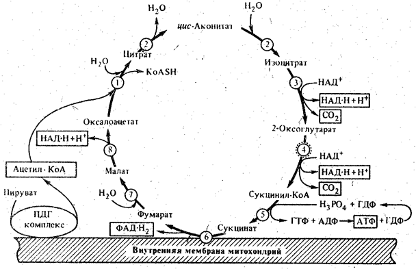 Катаболизм - последовательность ферментативных реакций, в результате которых происходит разрушение в основном за счет реакций окисления крупных молекул (углеводы, белки, липиды, нуклеиновые кислоты) с образованием легких (молочной и уксусной кислот, углекислого газа и воды) и выделением энергии заключенной в ковалентных связях различных соединений, часть энергии запасается в виде макроэргических связей, идущих затем на механическую работу, транспорт веществ, биосинтез крупных молекул. Различают три стадии катаболизма: I стадия - Пищеварение. Крупные пищевые молекулы расщепляются на строительные блоки под влиянием пищеварительных ферментов в ЖКТ, при этом выделяется 0.5-1% энергии, заключающейся в связях. II стадия - Унификации. Большое число продуктов, образовавшихся на 1 стадии дает во 2 стадии более простые продукты, Число которых невелико, при этом освобождается около 30% энергии. Ценна эта стадия еще тем, что освобождение энергии на этом этапе дает начало синтезу АТФ в бескислородных (анаэробных) условиях, что важно организму в условиях гипоксии. III стадия - Цикл Кребса. (трикарбоновых кислот / лимонной кислоты). По сути это процесс превращения двухуглеродного соединения (уксусная кислота) в 2 моль углекислого газа, но этот путь очень сложный, циклический, многоферментный, основной поставщик электронов в дыхательную цепь, и соответственно молекул АТФ в процессе окислительного фосфорилирования. Почти все ферменты цикла находятся внутри митохондрий, поэтому доноры электронов ЦТК свободно отдают электроны непосредственно дыхательной цепи мембранной системы митохондрий.