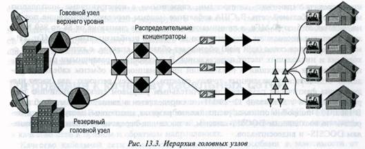 Простая кабельная сеть, которая обслуживает одну географическую зону, может быть представлена как сеть, имеющая единственный источник видеосигнала, часто получаемый со спутника, ретрансляционной антенны или другого типа приемного устройства. Упомянутый источник сигнала называется головным узлом и передает данные посредством группы кабельных узлов в конкретную географическую область. Каждый оптический узел затем подключается к коаксиальной распределительной сети (distribution network), с помощью которой видеосигналы доставляются на территорию отдельных абонентов. Каждый оптический узел часто аналогичен группе абонентов, такой, как многоквартирный дом, офис, городской квартал или микрорайон. Многие MSO-операторы, сформированные при объединении географически разделенных кабельных сетей, сталкиваются с трудностями при распространении информации по локальным кабельным сетям. Чтобы решить проблему расстояния без сокращения масштаба, присутствующего у крупных MSO-операторов, обычно разворачивают иерархическую сеть распределительных точек (distribution points), подобную показанной на рис. 13.3. Крупные MSO-операторы обычно обладают группой избыточных головных узлов, принимающих видеосигналы. Спутниковые приемники, декодеры и другое дорогостоящее оборудование способно обслуживать множество абонентских областей. Такие крупные головные узлы часто называются супер-узлами (super headends), они передают данные нескольким более мелким головным узлам для окончательной доставки. Некоторые распределительные точки, которые называются концентраторами (hubs), имеют меньший размер, чем головные узлы. Однако они служат в качестве точек, в которых основная сеть распространения видеопотока подключается к индивидуальным оптическим узлам посредством оптических передатчиков/приемников. Вместе узлы верхнего уровня, головные узлы и концентраторы позволяют использовать небольшую группу источников сигнала для обслуживания большого количества абонентов во многих областях и одновременно поддерживать высокий уровень доступности телевизионных услуг.