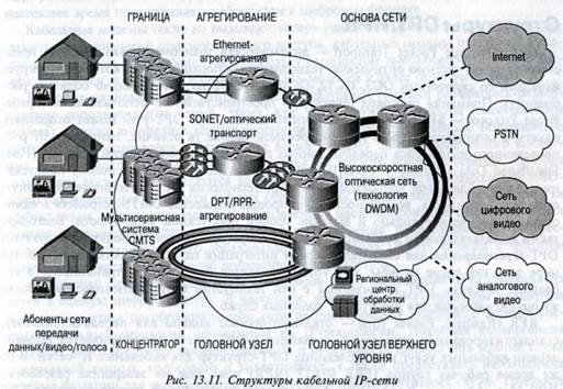 Топологии кабельных IP-сетей В связи с возрастающей популярностью кабельных модемов как высокоскоростной среды доступа возрастает насыщение кабельных IP-сетей большим количеством абонентского трафика. Обратная сторона популярности кабельных модемов заключается в том, что абоненты требуют предоставления им непрерывных услуг неизменно высокого качества. Иными словами, необходима чрезвычайно высокая надежность служб. Новые службы, основанные на протоколе IP, такие, как технология VoIP по кабельным структурам (cable drive), испытывают еще большую потребность в высокой надежности, высоком качестве обслуживания и интеграции служб. В настоящее время существуют три основных конструкции кабельных IP-сетей. Эти конструкции позволяют множеству CMTS-устройств объединяться и подключаться к высокоскоростной инфраструктуре базовой сети MSO-оператора. В указанные способы агрегирования CMTS-систем входят стандарт Ethernet, оптические соединения (обычно ОС12 или ОС48) и надежное оптическое кольцо (технология DPT/PRP). Целью каждой упомянутой конструкции является удовлетворение строгих требований к кабельным IP-сетям при одновременном соответствии бизнес-задачам кабельного оператора. На рис. 13.11 приведена эталонная сетевая структура, которая включает в себя способы агрегирования на основе технологий Ethernet, SONET и оптический транспорт, технологию DPT/RPR. Указанные объединяющие среды подключаются к основной высокоскоростной оптической сети, которая может включать в себя оптическое DWDM-кольцо. Сеть кабельного оператора в свою очередь подключена к IP-сетям (Internet), коммутируемой телефонной сети общего пользования (public switched telephone network — PSTN), а также к сетям распространения цифрового и аналогового видео. Несколько MSO-операторов обычно применяют объединение Ethernet-каналов для подключения множества CMTS-устройств к высокопроизводительному коммутатору. Такая топология часто реализуется при помощи группы соединений 100ВТ Fast Ethernet с распределением нагрузки или посредством одного или нескольких Gigabit Ethernet-соединений. Этот несложный метод агрегирования CMTS-устройств, т.е. коммутированный подход второго уровня, популярен, поскольку прост для понимания и конфигурирования. Кроме того, часто Ethernet-агрегирование представляет собой самый недорогой метод. Однако ограничения длины Ethernet-носителей и слабые временные характеристики восстановления после сбоев иногда могут ограничивать его эффективность. Поскольку в крупных сетях в конечном итоге потребуется использование протоколов маршрутизации, для коммутаторов крупных точек агрегирования в данной конструкции необходима связь с высокоскоростными маршрутизаторами. В крайних случаях, где отдельная CMTS-система могла бы поддерживать десятки тысяч абонентов сети кабельных модемов, существуют обширные требования маршрутизации для самой системы CMTS, и в точке афегирования, вероятно, используются платформы маршрутизации (поддержка технологий третьего уровня).