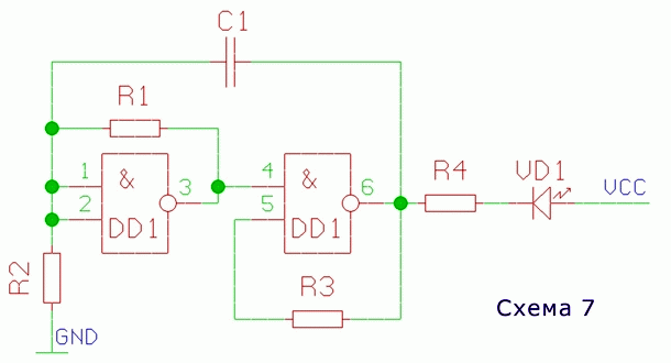 Величину сопротивления R1 можно уменьшить до 500 Ом (!!!). Для индикации к выходам генераторов через сопротивления подключены светодиоды VD1, VD2. Обратите внимание на правильность их подключения - катодами к линии GND. Соединение, обозначенное на схеме и на сборке знаком (!), устанавливается в последнюю очередь. 8. Период, скважность, частота: Если схема генератора собрана правильно, то светодиод, подключенный к выходу генератора, должен мигать (при соответствующих параметрах RC элементов). Или, светодиод периодически светится и не светится.