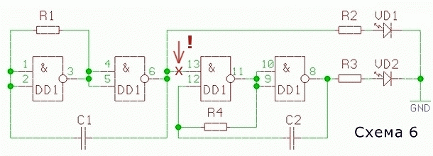 DD1 – К155ЛА3, R1-R4 – 1 кОм, С1 – 470,0 мкФ. Сравните, ранее собранную, схему 5.3 (см. выше) и следующую схему. В следующей схеме - уже два генератора.