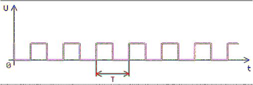 Временной отрезок с высоким уровнем напряжения (импульс) и низким (пауза) в сумме составляют величину T, при этом они периодически повторяются. Т – это Период или промежуток времени, через который повторяются значения напряжений. Важно отметить: - в большинстве схем генераторов, построенных на элементах 155 серии, номинал сопротивления должен быть менее 500 Ом (только тогда генератор будет работать). - временные отрезки импульса и паузы будут почти равными при R1 =100 Ом, а при увеличении сопротивления R1 длительности импульса и паузы начинают отличаться друг от друга и даже в несколько раз при максимальной величине сопротивления. Если время периода T поделить на время длительности импульса (высокий уровень напряжения), то получим величину Скважности (S). При меандре S = 2, а если длительность импульса меньше длительности паузы, то величина S > 2. Частота - f= 1/T - как часто или сколько проходит импульсов и пауз (периодов) в течение одной секунды. Например, при T = 0.5 сек (полсекунды), f = 1 / 0.5 c = 2 Гц (за секунду можно заметить две вспышки светодиода). Но, чем частота ближе к значению 25 Гц, тем хуже человеческий глаз будет различать световые вспышки светодиода и паузы между ними. Свечение светодиода постепенно сливается, и при частоте более 25 Гц он будет как бы постоянно светиться. Для этого попробуйте изменять номиналы элементов.