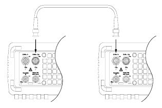 Прежде всего, следует выбрать один генератор в качестве ведущего («master»), а другой в качестве ведомого («slave»). Как показано на рисунке 2, соединить выход 10 MHz Out ведущего генератора с входом 10 MHz In ведомого, используя для этого высококачественный коаксиальный кабель. При такой конфигурации частоты обоих генераторов будут строго одинаковы и не будет медленно изменяющегося сдвига фаз между сигналами обоих приборов.