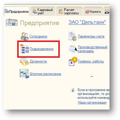Задание 19.2. Заполните справочник Подразделения (справочник предназначен для хранения списков подразделений для управленческого учета), взяв данные из Таблицы1. Откройте список подразделений организации, нажав на кнопку «Подразделения»»(Рис.8)