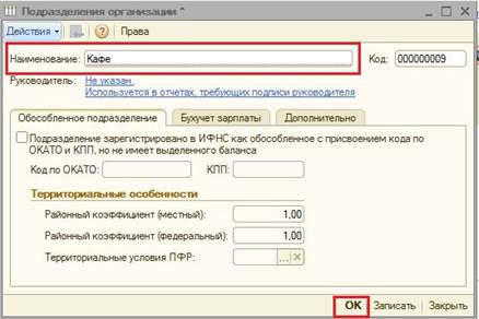 Рис.10. Появится окно «Подразделения организации». Заполните: «Наименование организации»: Кафе. Нажмите кнопку «Ок» (Рис.11)