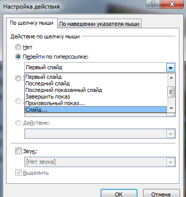 Аналогично для остальных слайдов (по содержанию). 2. Переходим на третий слайд выбираем Вставка - Фигуры - Управляющие кнопки. Рисуем в левом нижнем углу слайда три кнопки Настраиваем гиперссылки. Выделяем кнопку Выбираем в меню Вставка-Гиперссылка