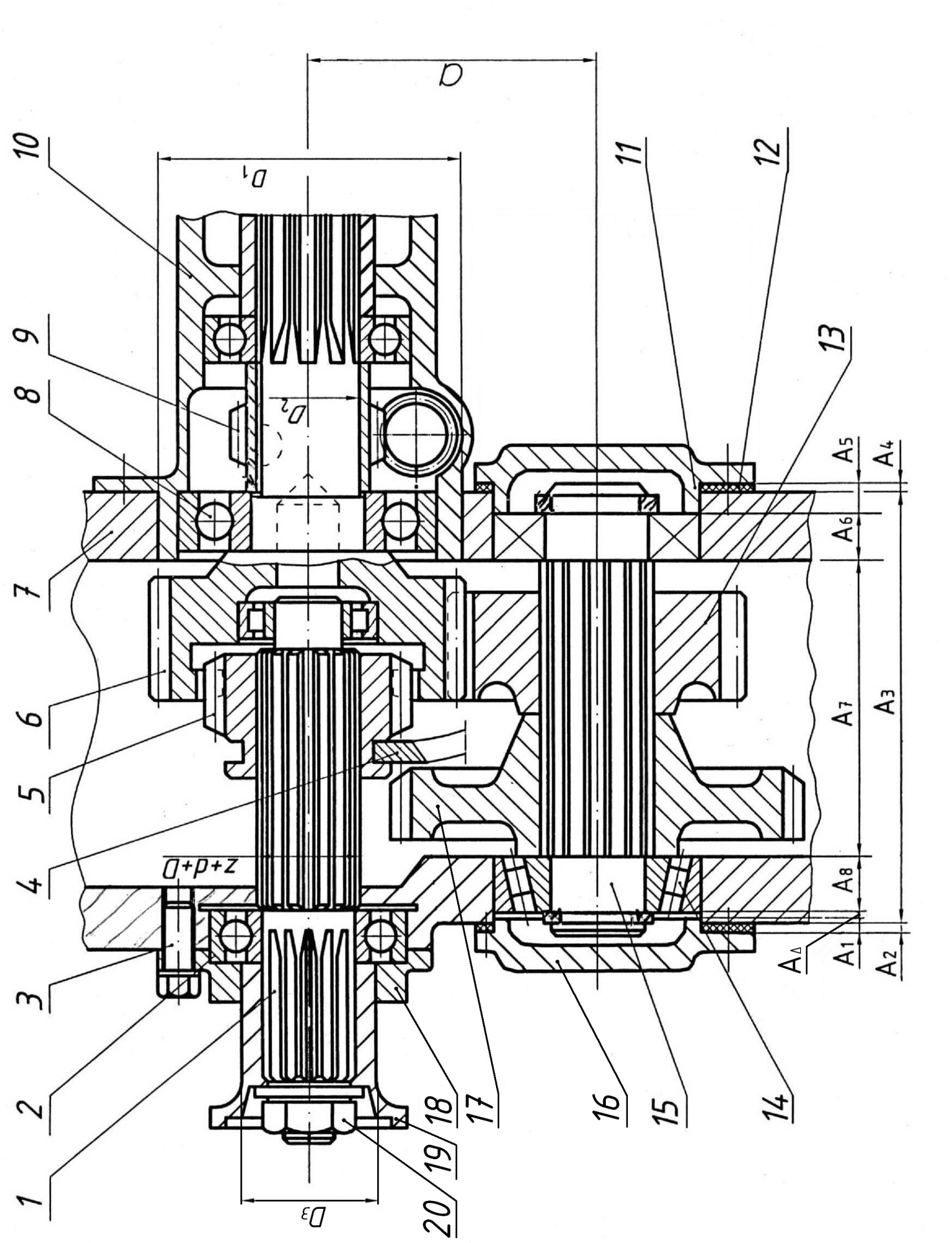 На рис.3 изображена часть раздаточной коробки автомобиля; эта коробка служит для передачи крутящего момента к ведущим мостам автомобиля. Зубчатое колесо 5 включения заднего моста перемещается по шлицам передаточного вала 1 с помощью вилки 4. Правый конец вала опирается на подшипник качения, установленный в гнездо зубчатого колеса 6, изготовленного как одно целое с вторичным валом. Левый конец вала 1 имеет подшипник 2, который закрыт крышкой 18, которая установлена на крыльчатке 19 по D3 с незначительным зазором и крепится винтами 3 с нормальной длиной свинчивания к корпусу 7. Величина зазора должна быть строго выдержана (оговорено заданием). Гайка 20, которая закрепляет крыльчатку, имеет короткую длину свинчивания. На хвостовике вторичного вала 6 по D2 на сегментной шпонке с незначительным зазором установлено зубчатое колесо 9 привода спидометра. В корпус 10 установлен подшипник 8 вторичного вала. Корпус 10 точно центрируется по D1 в корпусе раздаточной коробки 7. На шлицевом валу 15 смонтированы промежуточное колесо 13 и зубчатое колесо понижающей передачи 17. При положении, указанном на чертеже, включена прямая передача; при введении зубчатого колеса 5 в зацепление с зубчатым колесом 17, включается понижающая передача. Шлицы в отверстиях зубчатых колёс закаливаются. Зубчатая передача среднескоростная, колёса стальные с нагревом до +70 º С, корпус раздаточной коробки изготавливается из силумина и нагревается до +60 º С. Крышки подшипников 16 и 11 должны свободно устанавливаться в отверстия корпуса, так как их подтяжкой регулируются зазоры в конических подшипниках 14. Крышки подшипников крепятся при помощи болтов, имеющих резьбу нормальной длины свинчивания. Подшипники качения испытывают умеренные толчки и вибрации и при работе имеют перегрузки до 300 %. Между крышкой 16 и подшипником 14 предусмотрен тепловой зазор, величина которого обеспечивается расчетом размерной цепи.