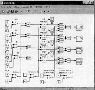Запись слова в регистр производится по сигналу запуска процесса моделирования (Simulation Start), что может быть проконтролировано на дисплеях Q0-Q3. Запишите в регистр произвольное четырехразрядное двоичное слово и убедитесь в правильности его записи. Считывание хранимого в регистре слова может осуществляться в прямом или обратном коде, в зависимости от положения ключей Считывание в прямом коде/Считывание в обратном коде. Считывание производится по сигналу запуска процесса моделирования (Simulation Start). Произведите считывание записанного в регистре слова в прямом и обратном коде и убедитесь в правильности его считывания. Обнуление всех разрядов регистра производится путем подачи сигнала логической единицы с ключа Установка 0 и запуска процесса моделирования. Произведите обнуление всех разрядов регистра.