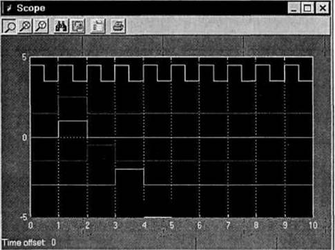 Рисунок 4 В схеме моделирования применяются блоки Память (Memory), которые находятся в библиотеке Simulink/Nonlinear и необходимы для запоминания предыдущего состояния триггеров в процессе моделирования. В схеме моделирования используются два блока Ступенчатое воздействие (Step, Stepl), которые в комбинации с сумматором формируют одиночный импульс на входе сдвигающего регистра. В блоке Step нужно установить Step time: 1, Initial value: 0, Final value: 1. В блоке Stepl нужно установить Step time: 2, Initial value: 0, Final value: 1. Последовательный сдвиг импульса на один разряд от триггера D к триггеру D3 будет осуществляться с приходом каждого нового синхроимпульса от генератора синхроимпульсов Clock. Результатом моделирования должна быть временная диаграмма на осциллографе (рис. 5), иллюстрирующая последовательный сдвиг импульса от триггера D к триггеру D3 с приходом на вход регистра каждого нового синхроимпульса.