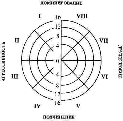 Доминирование = (I – V) + 0,7 х (VIII + II – IV – VI) Дружелюбие = (VII – III) + 0,7 х (VIII – II – IV + VI) Таким образом, система баллов по 16 межличностным переменным превращается в два цифровых индекса, которые характеризуют представление субъекта по обозначенным параметрам. В результате проводится анализ личностного профиля – определяются типы отношения к окружающим. Положительное значение результата, полученного по формуле " доминирование ", свидетельствует о выраженном стремлении человека к лидерству в общении, к доминированию. Отрицательное значение указывает на тенденцию к подчинению, отказу от ответственности и позиции лидерства. Положительный результат по формуле " дружелюбие " является показателем стремления личности к установлению дружелюбных отношений и сотрудничеству с окружающими. Отрицательный результат указывает на проявление агрессивно-конкурентной позиции, препятствующей сотрудничеству и успешной совместной деятельности. Количественные результаты являются показателями степени выраженности этих характеристик. Наиболее заштрихованные на профиле октанты соответствуют преобладающему стилю межличностных отношений данного индивида. Характеристики, не выходящие за пределы 8 баллов, свойственны гармоничным личностям. Показатели, превышающие 8 баллов, свидетельствуют об акцентуации свойств, выявляемых данным октантом. Баллы, достигающие уровня 14-16, свидетельствуют о трудностях социальной адаптации. Низкие показатели по всем октантам (0-3 балла) могут быть результатом скрытности и неоткровенности испытуемого. Если в психограмме нет октантов, заштрихованных выше 4-х баллов, то данные сомнительны в плане их достоверности: ситуация диагностики не расположила к откровенности. Первые четыре типа межличностных отношений (октанты 1-4) характеризуются тенденцией к лидерству и доминированию, независимостью мнения, готовностью отстаивать собственную точку зрения в конфликте. Другие четыре октанта (5-8) – отражают преобладание конформных установок, неуверенность в себе, податливость мнению окружающих, склонность к компромиссам. В целом интерпретация данных должна ориентироваться на преобладание одних показателей над другими и в меньшей степени - на абсолютные величины. В норме обычно не наблюдаются значительные расхождения между «Я» актуальным и идеальным. Умеренное расхождение может рассматриваться как необходимое условие самосовершенствования. Неудовлетворенность собой чаще наблюдается у лиц с заниженной самооценкой (5,6,7 октанты), а также у лиц, находящихся в ситуации затянувшегося конфликта (4 октант). Преобладание одновременно 1 и 5 октанта свойственно лицам с проблемой болезненного самолюбия, авторитарности, 4 и 8 – конфликт между стремлением к признанию группой и враждебностью, т.е. проблема подавленной враждебности, 3 и 7 –борьба мотивов самоутверждения и аффилиации, 2 и 6 – проблема независимости-подчиняемости, возникающая в сложной служебной или иной ситуации, вынуждающей повиноваться вопреки внутреннему протесту. Личности, у которых обнаруживаются доминантные, агрессивные и независимые черты поведения, значительно реже проявляют недовольство своим характером и межличностными отношениями, однако и у них может выявляться тенденция к совершенствованию своего стиля межличностного взаимодействия с окружение